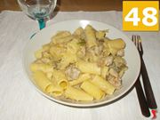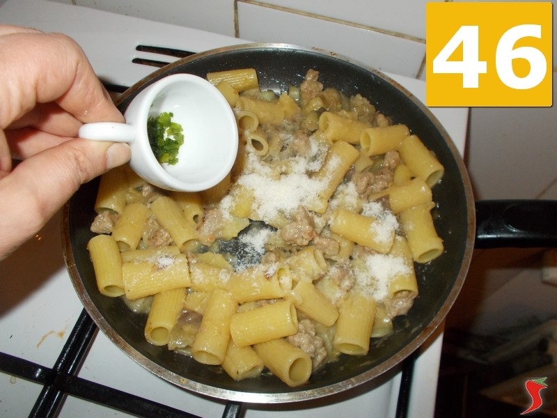 Quando i rigatoni saranno cotti, saltateli direttamente in padella (43) e mescolate con cura (44) per un minuto a fiamma molto bassa. Quindi aggiungete anche il parmigiano (45).