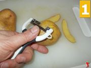Cominciate la ricetta mettendo una pentola colma di acqua salata sul fuoco, per farla bollire e poi lessare gli ortaggi. Quindi prendete le patate, sbucciatele (1) con il pelapatate, e poi mettetele nell'acqua (2) a lessare per circa mezzora. Una volta cotte, mettetele a scolare (3) in uno scolapasta e fatele raffreddare. Intanto mettete un'altra pentola colma di acqua salata sul fuoco, in cui lesserete brevemente i carciofi.