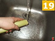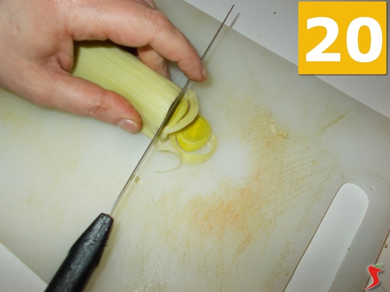 Ora iniziate a preparare il porro per il soffritto. Lavatelo (19) bene sotto l'acqua corrente e quindi asciugatelo, per metterlo sul tagliere. Tritatelo (20) finemente e poi mettetelo su un piattino (21) per lasciarlo a parte.