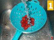 Iniziate la ricetta lavando bene i pomodorini (1) sotto l'acqua corrente, per poi porli sul tagliere. Quindi tagliate i pomodorini pachino in due (2) e metteteli da parte (3) in una ciotolina.