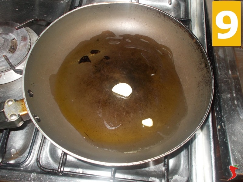 Ora sbucciate lo spicchio d'aglio (7) e versate tre cucchiai di olio extravergine di oliva (8) in una padella antiaderente. Fateli scaldare e mettete a soffriggere lo spicchio d'aglio (9), finché non si colora un pochino.