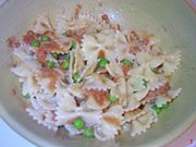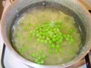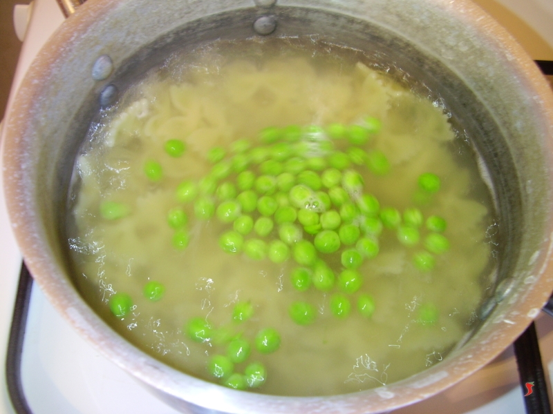 Nel frattempo avrete messo a bollire l'acqua per la pasta. Quando questa sarà giunta a metà cottura aggiungete i piselli per scottarli nell'acqua e quindi scolateli insieme alla pasta quando pronta. Mettete dunque il tutto in una bowl.