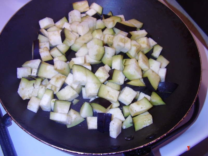 Prendete dunque una padella media e antiaderente, metteteci un filo d'olio senza esagerare e uno spicchio d'aglio per farlo dorare. Quindi aggiungete i dadini di melanzane per farli scottare 10 minuti e non oltre.
