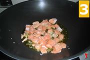 Per prima cosa bisogna preparare un soffritto di aglio e cipolla, tritando aglio e cipolla (1) e mettendo tutto a soffriggere in una padella con olio extravergine di oliva (2). Una volta soffritta la cipolla aggiungete il salmone tagliato a pezzi(3).
