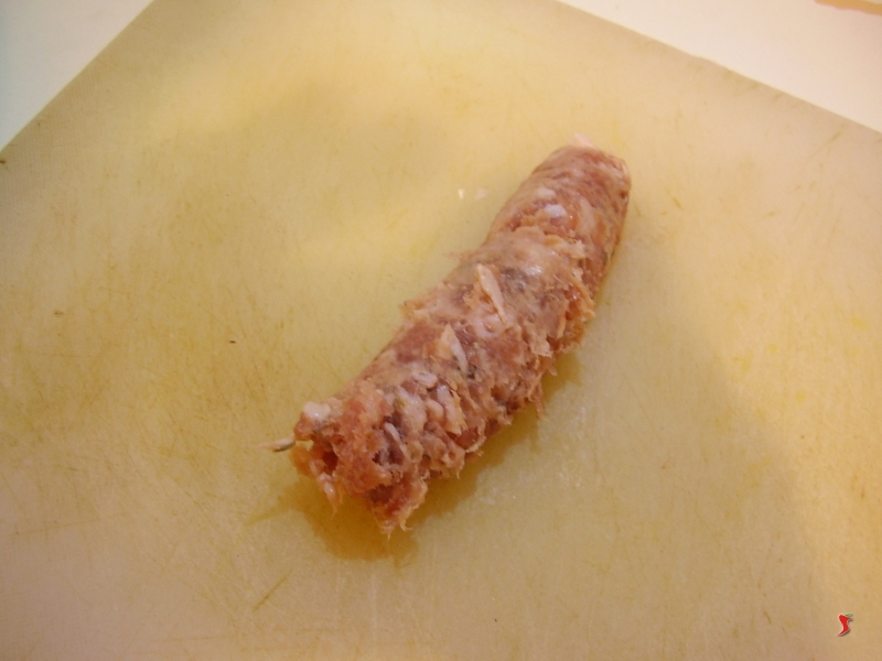 Ora è la volta della salsiccia. Incidetela e quindi sfilatela dal budello per tagliarla in tanti piccoli pezzi.