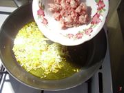 Prendiamo una padella ampia ed antiaderente e poniamoci cinque cucchiai d'olio a scaldare. Quindi mettiamo dentro la carota grattugiata e la cipolla tritata e soffriggiamo fino a che la cipolla diviene trasparente. A questo punto prendiamo i pezzi di salsiccia e mettiamola in padella per farla rosolare in tutte le parti.