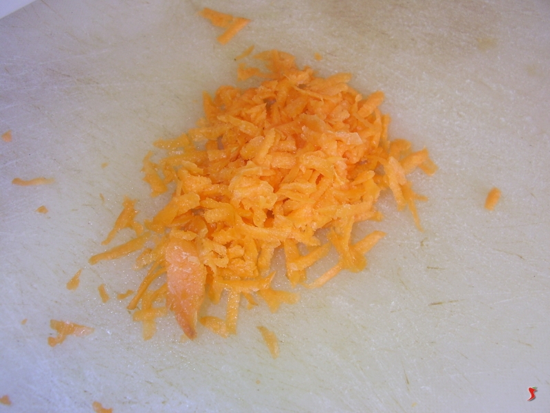 Questa ricetta si inizia preparando gli ingredienti per il classico soffritto, tritando quindi finemente la cipolla, il sedano, e grattando grossolanamente la carota.