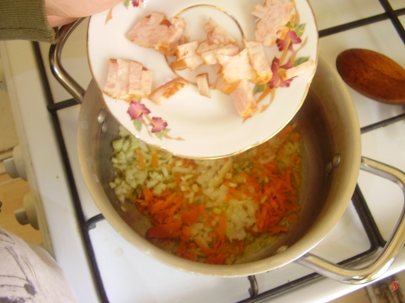 Quindi dovrete tagliare la pancetta a dadini, tagliandola prima a fette e quindi infine a cubetti. Mettete da parte e passate oltre.