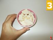 Che cosa c'è di meglio, magari dopo aver trascorso una bella giornata di mare, che tornare a casa e continuare a sentire l'odore del mare anche nel piatto? Per portare il mare in tavola basta davvero ... Iniziate la ricetta ponendo la mozzarella fresca sopra un tagliere e dopo con un coltello dividetela inizialmente in due parti e poi in quattro (1) ed una volta terminato questo passaggio, iniziate a realizzare dei pezzi non troppo spessi (2). Quando avrete lavorato tutta la mozzarella, lasciate da parte dentro un contenitore (3).
