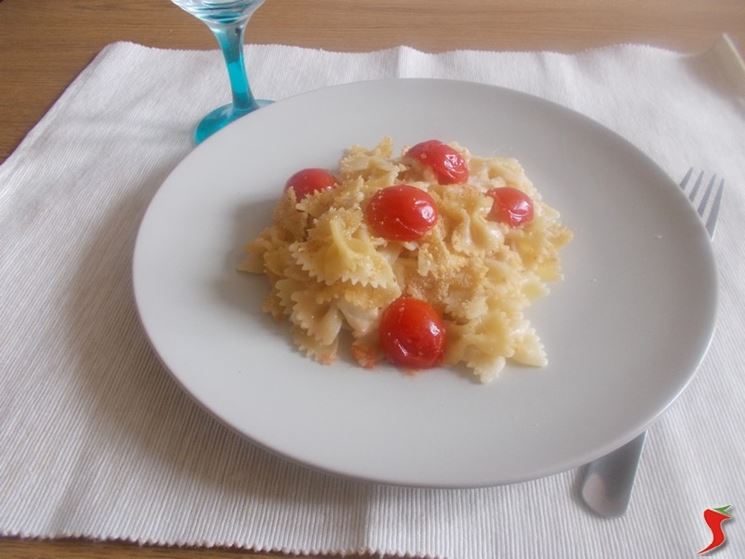 Prendete una teglia da forno rettangolare anche usa e getta e trasferite al suo interno la pasta appena cotta (13), e subito dopo il condimento (14). Dopo con un cucchiaio mescolate accuratamente e spolverate con il pan grattato (15). Mettete in forno e lasciate cuocere al grill per circa dieci minuti. Una volta ben dorato lo strato di pane, sfornate la pietanza ed impiattatela ben calda, servendola in tavola con del buon vino bianco dai sapori fruttati.