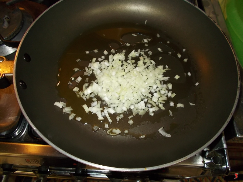 Ora prendete la cipolla e tritatela finemente. Quindi in una padella ampia ed antiaderente versate quattro cucchiai di olio extravergine di oliva e fatelo scaldare per poi mettere a soffriggere la cipolla a fuoco medio basso finché non diviene trasparente.