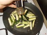 Una volta fatta diventare trasparente la cipolla aggiungete in cottura i bastoncini di zucchine, mescolando bene per farli aromatizzare con l'olio alla cipolla. Una volta assorbito bene l'olio pepate e salate, e quindi lasciate andare la cottura per circa 10 minuti girando spesso per non attaccare il fondo e coprendo con un coperchio.