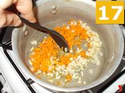 Ora potete iniziare il soffritto, versando cinque cucchiai di olio extravergine di oliva (13) in un tegame capiente. Fateli scaldare e quindi unite prima la cipolla tritata (14) e poi la carota grattugiata (15).
