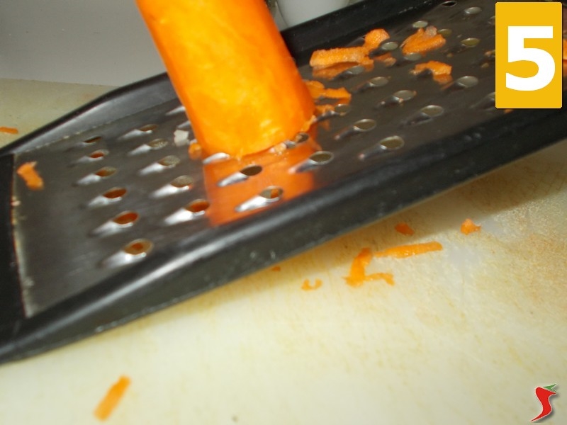 Quindi prendete la carota e pelatela (4) con il pelapatate. Poi grattatela (5) con il grattaverdure e mettetela su un piattino (6) per riprenderla in seguito.