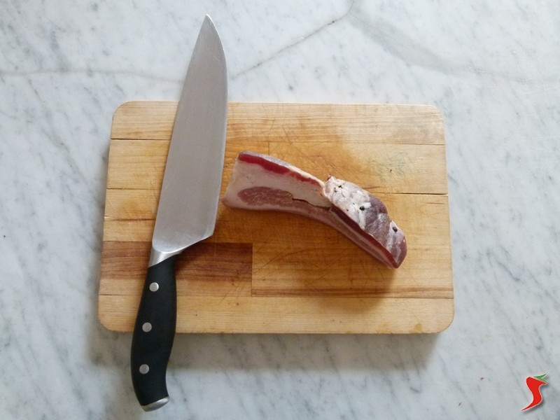 Prendere il pezzo di pancetta tesa da 150 grammi e riporla su di una superficie piana, se si dispone di una tavoletta di legno, meglio ancora. Iniziare a tagliarla in tanti piccoli cubetti.