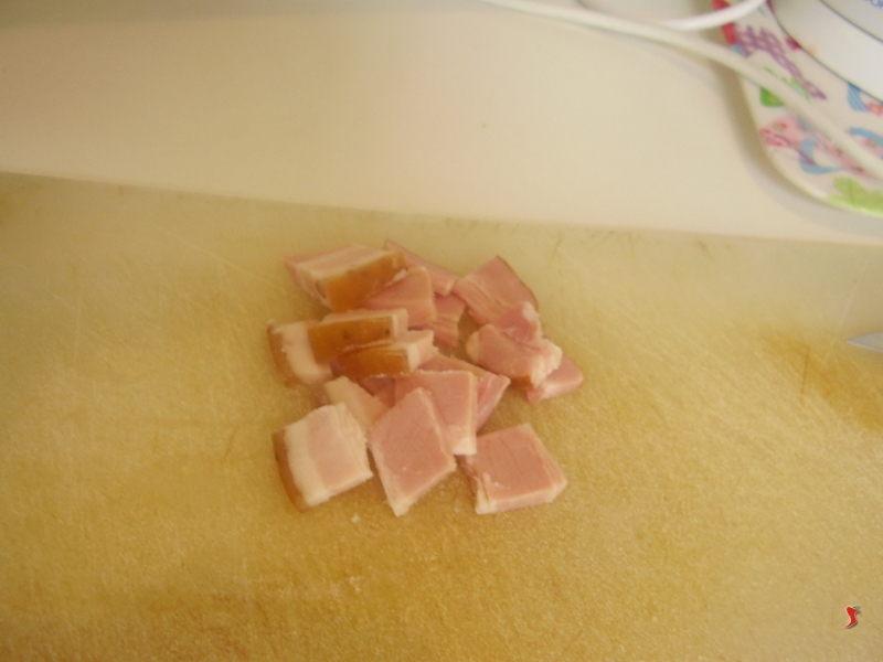 Il primo passo è quello di preparare la pancetta affumicata da soffriggere. Tagliatela prima a fette e poi a cubetti, e mettetela da parte. Quindi prendete una padella ampia e antiaderente e versateci quattro cucchiai d'olio extravergine di oliva.