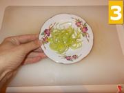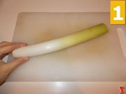 Prendete il porro e ponetelo sopra un tagliere (1), dopo con un coltello dalla lama seghettata sminuzzatelo finemente (2) ed appena terminata questa operazione, lasciate da parte il composto su un piattino piano (3).