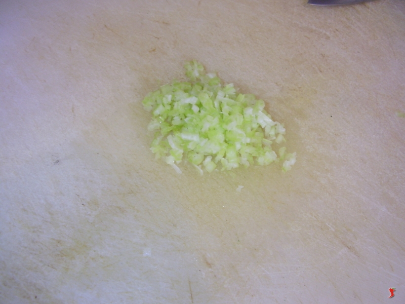Per prima cosa iniziate a preparare gli ingredienti per il soffritto, tritando finemente sia la cipolla che il sedano. Quindi prendete una padella ampia ed antiaderente per versarci cinque cucchiai d'olio extravergine d'oliva.