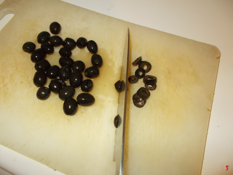 Nel frattempo prendete le olive e disponetele sul tagliere. Con il coltello grande iniziate a tagliarle a rondelle per poi metterle da parte in una ciotolina.