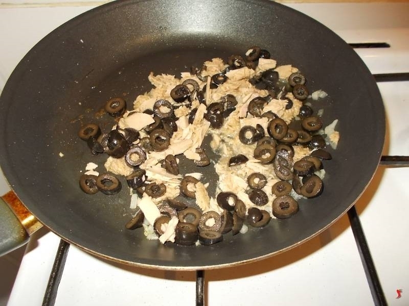 Quando le acciughe si sono sciolte aggiungete anche il tonno che avrete precedentemente sbriciolato e lavorato con una forchetta. Giratelo bene nell'olio aromatizzato dalle acciughe e quindi aggiungete anche le rondelle di olive, lasciando andare per circa cinque minuti e girando spesso con il cucchiaio di legno, a fuoco medio prima e a fuoco dolce poi.