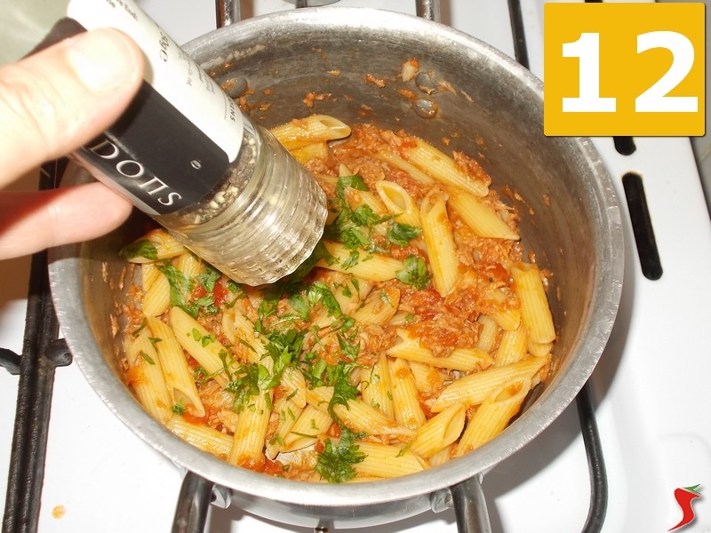 Nel frattempo avrete messo a bollire abbondante acqua salata per lessare le pennette. Fate in modo che la cottura della pasta coincida con quella del condimento. I tempi di cottura sono quelli indicati in confezione e in genere si aggirano sui dieci minuti. Una volta pronta la pasta scolatela e saltatela direttamente nel tegame (10). Mescolate bene a fuoco molto dolce per circa un minuto e quindi spegnete il fuoco. Nel frattempo avrete tritato finemente il prezzemolo e lo aggiungerete (11) nella casseruola alla pasta. Quindi pepate (12) a vostro piacere se lo desiderate con del pepe nero macinato fresco, mescolate bene di nuovo e impiattate subito, per servire in tavola ben caldo.
