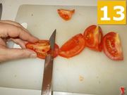 Quindi lavate bene il pomodoro e mettetelo sul tagliere per tagliarlo in quarti. Eliminate le parti vegetali (13) e quindi tagliate la polpa in pezzi (14) da mettere in una ciotolina per unirli subito alla padella (15) con il resto degli ingredienti. Continuate la cottura per circa mezzora a fuoco moderato coprendo con il coperchio.