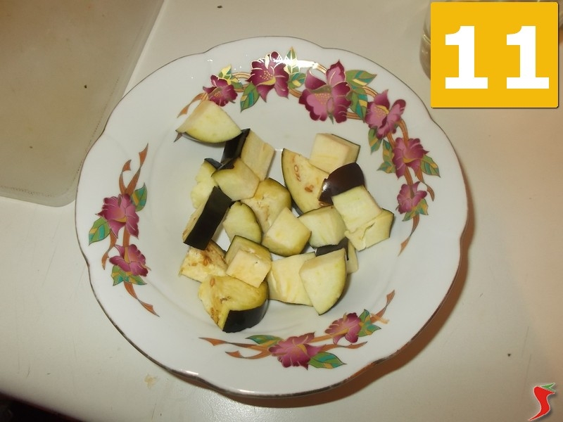 Ora lavate bene la mezza melanzana e iniziate a tagliarla a dadini (10) da mettere in una ciotolina (11). Quindi uniteli alla padella (12) con i peperoni e fate cuocere altri cinque minuti prima di unire gli altri ingredienti.