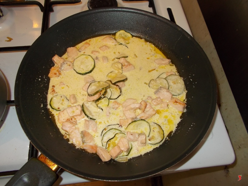 Dopo dieci minuti aggiungete anche il salmone a dadini e iniziate a mescolare per far insaporire e scottare il salmone. Lasciate andare per cinque minuti, sempre girando, per poi aggiungere la panna per farla scaldare con il fuoco al minimo.