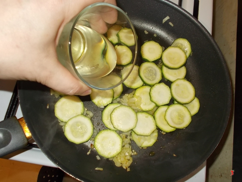 Quando la cipolla inizia ad essere trasparente mettete le rondelle di zucchine a cuocere nella padella. Lasciate andare cinque minuti per far insaporire bene e quindi aggiungete il vino per farlo sfumare in modo che formi un seghetto denso di fondo. Quindi salate e pepate le zucchine e continuatene la cottura per altri dieci minuti.