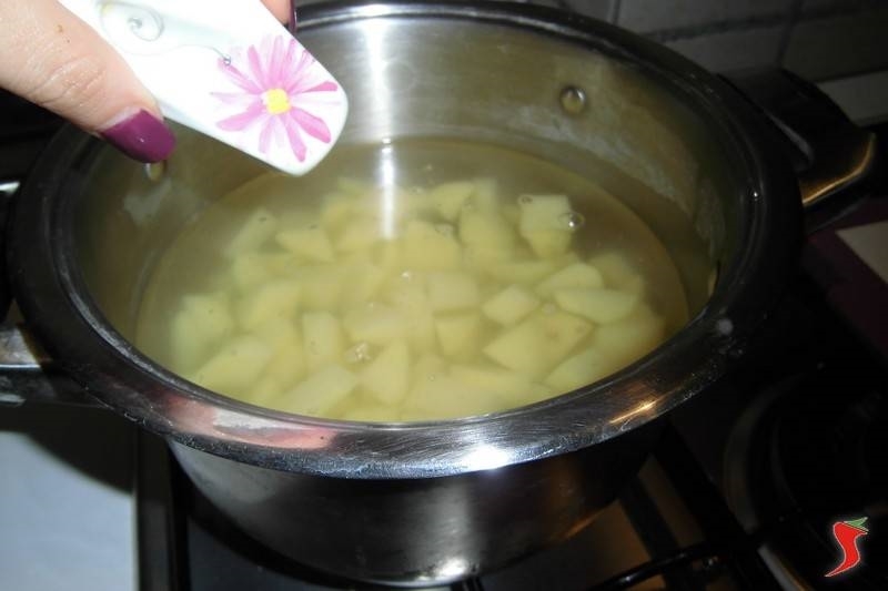 Per prima cosa bisogna lavare, pelare e tagliare a cubetti le patate. Una volta tagliate le mettete in una pentola e coprite con acqua fredda.