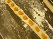 Prendete ognuna delle quattro parti allungandole per ottenere dei sigari piuttosto cicciotti. Quindi infarinate una spianatoia, poneteli sopra e iniziate a schiacciarle, dapprima con le mani e poi con il mattarello in modo da ottenere una sfoglia sottile meno di un millimetro, lunga e rettangolare, larga circa 4 centimetri.Prendete la purea di zucca e ponete un cucchiaino ogni due centimetri per tutta la lunghezza della sfoglia, distribuendo sulla parte superiore. Prendete quindi la parte inferiore e richiudetela sopra il ripieno. Se vi trovate meglio fate due fettucce da 2 cm e usatene una come "coperchio".Tagliate quindi tra un ripieno e l'altro per ottenere i vostri ravioli quadrati che avrete cura di chiudere bene con una forchetta lungo i tre lati aperti. Metteteli ben infarinati su un piatto e iniziate a preparare il condimento.