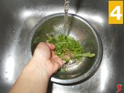 Prendete la rucola che avete a disposizione e dopo averla messa dentro uno scolapasta lavatela accuratamente sotto abbondante acqua corrente (4), completato questo passaggio, strizzatela bene e dopo tagliuzzatela finemente con un coltello dalla lama seghettata (5). Una volta lavorata tutta la rucola, lasciatela da parte dentro un piattino piano (6).