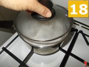 Aggiungete nella casseruola con l'acqua in ebollizione il farro che avete a disposizione (16), mescolate con un cucchiaio accuratamente (17) e coprite con un coperchio (18) lasciando cuocere per circa quaranta minuti a fiamma moderata.