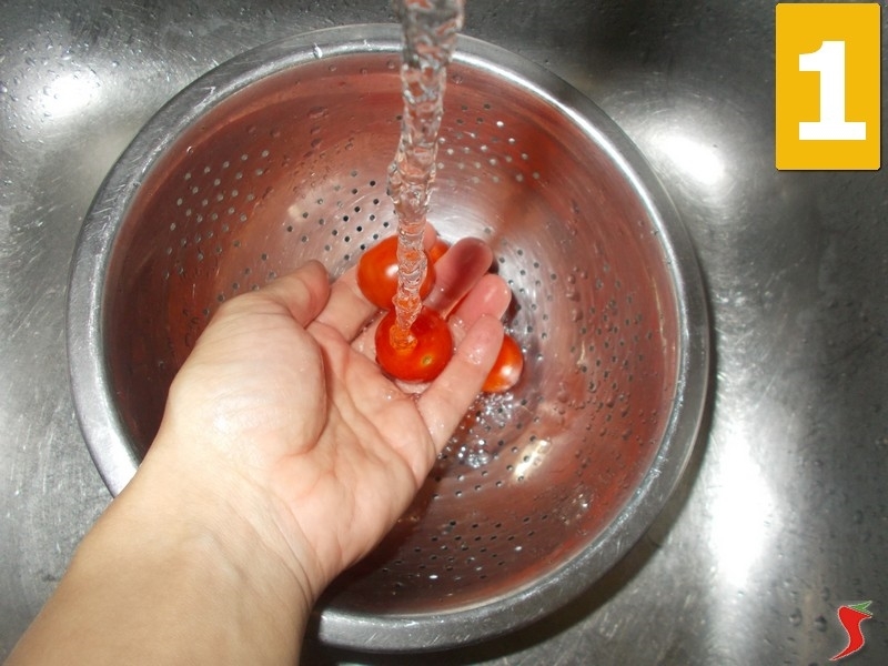Iniziate la ricetta lavando accuratamente i pomodori pachino sotto abbondante acqua corrente dentro uno scolapasta (1) ed una volta puliti poneteli sopra un tagliere e con un coltello dalla lama seghettata divideteli in due parti (2). Terminata questa operazione lasciate da parte l'ortaggio lavorato dentro un piattino piano (3).