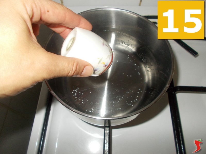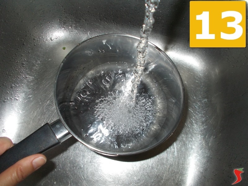Riempite di acqua corrente una casseruola di medie dimensioni (13) dopo mettetela a scaldare sul fuoco e copritela con un coperchio (14). Lasciate che l'acqua raggiunga l'ebollizione e a questo punto aggiustatela di sale fino a vostro gradimento (15).