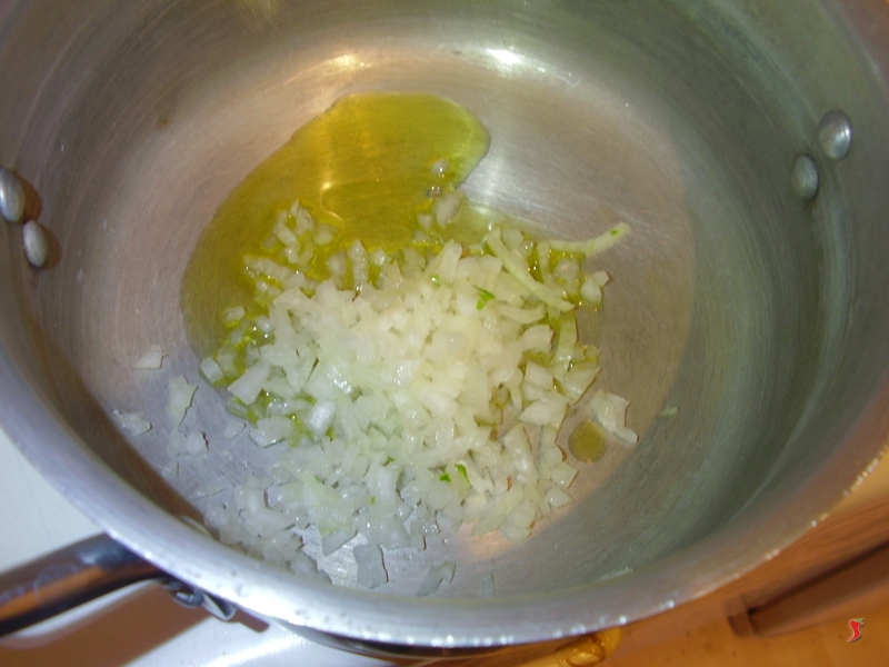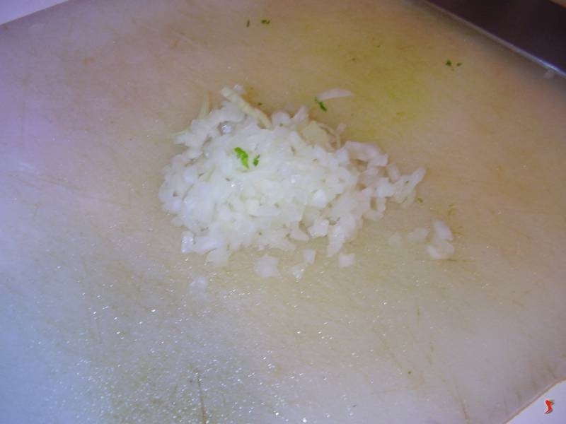 Dedicatevi ora al soffritto, classico con la cipolla. Dunque tritate finemente la cipolla con un coltello grande a lama liscia e mettetela da parte. Ora versate quattro cucchiai d'olio extravergine d'oliva in un tegame di media capienza. Fate scaldare prima di mettervi a rosolare la cipolla a fuoco medio.