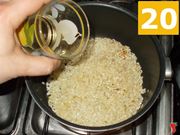 Quindi alzate la fiamma al massimo per un minuto, per tostare il riso girandolo spesso (19) per non farlo tostare. Poi versateci sopra il vino bianco (20) e fatelo sfumare, prima di aggiungere la pera a dadini (21). Abbassate la fiamma a metà.