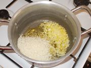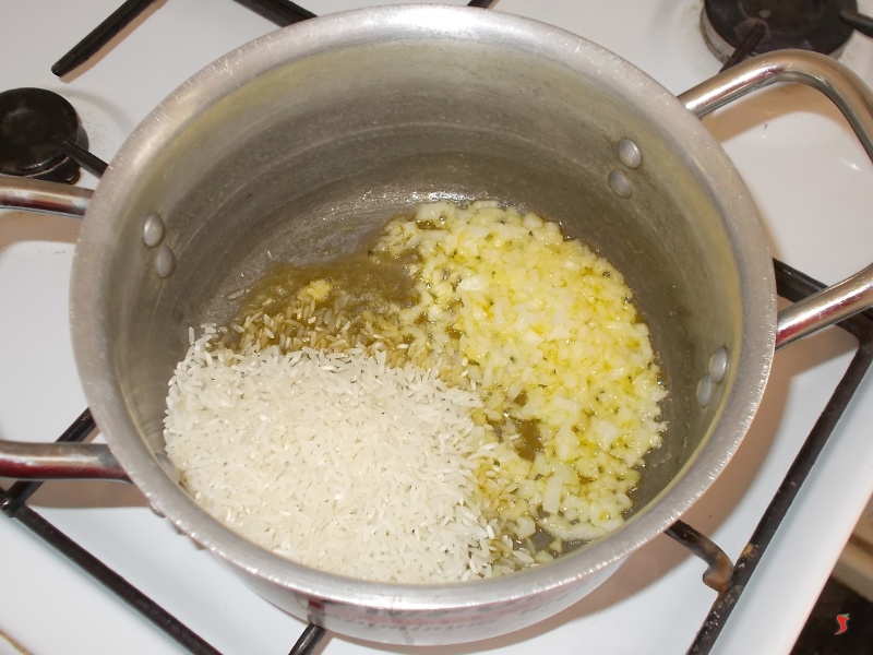 Una volta che la cipolla è diventata trasparente alzate la fiamma al massimo e mettete il riso a tostare per meno di un minuto, girando con un cucchiaio di legno per non farlo attaccare. Quindi abbassate subito la fiamma al minimo e versate subito il vino bianco, mescolando bene per farlo sfumare.