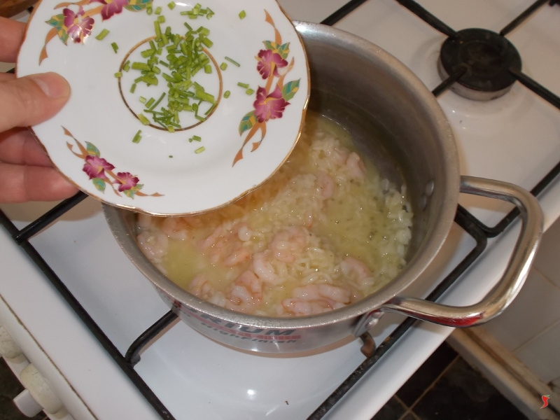 Una volta arrivati a qualche minuto dalla cottura del riso aggiungete anche i gamberetti sgusciati e già cotti, mescolate con il cucchiaio di legno per amalgamare il tutto e portate a fine cottura.Nel frattempo tritate l'erba cipollina e una volta cotto il riso aggiungete una piccola noce di butto a mantecare e quindi l'erba cipollina tritata, seguendo con una spolverata di pepe nero. Impiattate e servite in tavola ben caldo affiancando il piatto con il macinino del pepe nero per chi volesse aggiungerne.