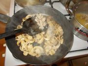 Dopo dieci minuti di cottura dei funghi prendete le salsicce con un mestolo forato e mettetele a finire con i funghi per altri 10 minuti. A fine cottura eliminate l'aglio e il peperoncino e mettete tutto in una scodella, incluso il sughetto di fondo. Tenete anche il sughetto di fondo nella pentola dove avete cotto le salsicce.