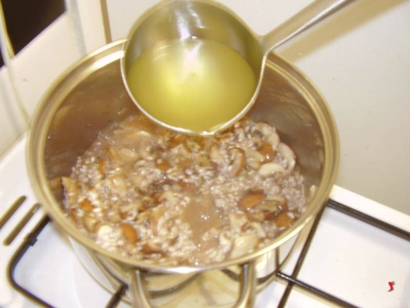 Per iniziare dovrete sminuzzare finemente la cipolla, tritare il prezzemolo, e tagliare a fettine i funghi. Mettete il brodo a riscaldare, per averlo ben caldo durante la cottura del riso.Quindi ponete 10 cucchiai di olio in una pentola bella grande e fonda, mettete la cipolla e iniziate a dorarla a fuoco medio.