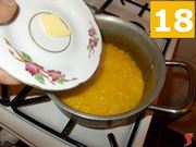 Continuate ad aggiungere brodo facendo cuocere per il tempo di cottura indicato sulla confezione del riso. Salate (16) il riso durante la cottura e mescolate (17). Arrivati alla fine della cottura, spegnete il fuoco e mettete nel riso una noce di burro (18) per far mantecare. Mescolate e proseguite.
