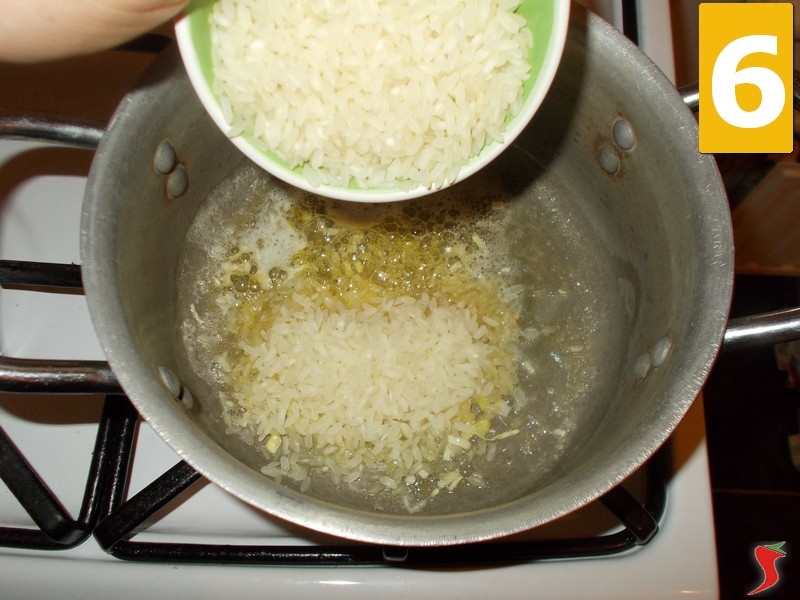 Alzate la fiamma al massimo per tostare il riso per un minuto, mescolando bene (7) per non farlo bruciare. Quindi versateci sopra il vino bianco (8) a sfumare, continuando a mescolare bene (9) con il cucchiaio.