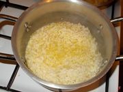 Quando la cipolla inizia a trasparire alzate la fiamma al massimo per poi aggiungere il riso a tostare per un massimo di un minuto, mescolando bene e facendo attenzione a che non si attacchi al fondo.