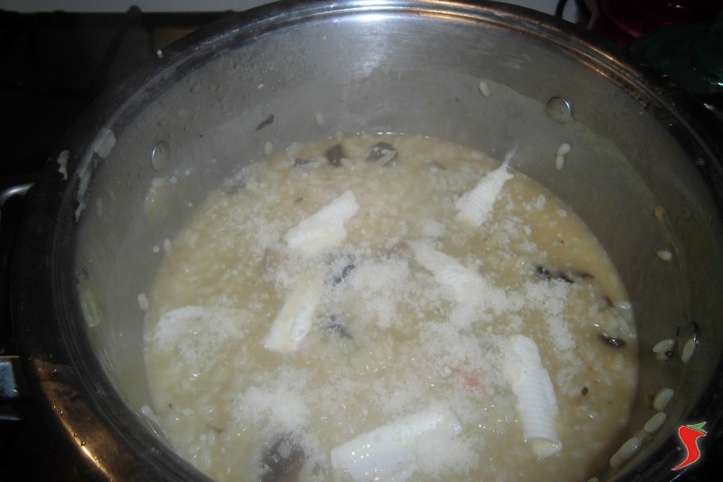 Aggiungere i funghi quando il riso ha raggiunto metà cottura. Quando il riso è cotto spegnete il fuoco , aggiungete dei fiocchetti di burro e il grana padano grattugiato. Mescolare bene e servire il risotto.