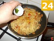 Quando gli spaghetti sono pronti, scolateli (19) e saltateli direttamente in padella (20). Quindi mescolate con cura (21) e proseguite.