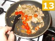 Una volta che le acciughe si sonno sciolte, aggiungete anche il tonno sgocciolato (10), che mescolerete bene (11) per farlo insaporire. Dopo qualche minuto, aggiungete anche i pomodorini ciliegino (12) che avevate tagliato.