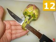 Ora tagliate il gambo del carciofo (4) a circa uno o due centimetri dal fiore. Quindi tagliate a metà i gambi (5) dei carciofi, e poi togliete la corteccia esterna (6), tagliandola via con il coltello seghettato per lasciare solo la parte interna, bianca e morbida.