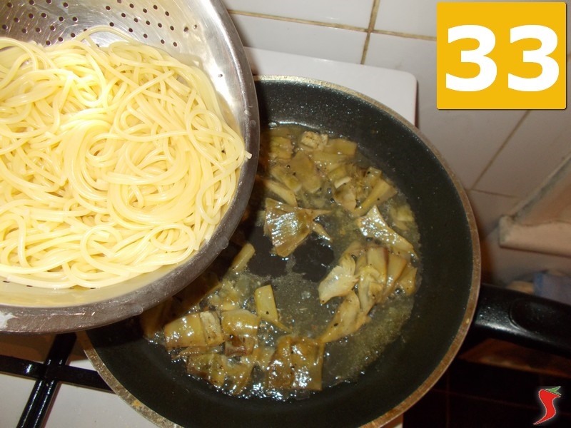 Eliminate l'aglio (31) e lasciate cuocere per altri dieci minuti (32), schiacciando leggermente i carciofi. Nel frattempo avrete messo a bollire abbondante acqua salata per lessare la pasta. Una volta pronta, scolatela e saltate gli spaghetti nella padella (33) con i carciofi.