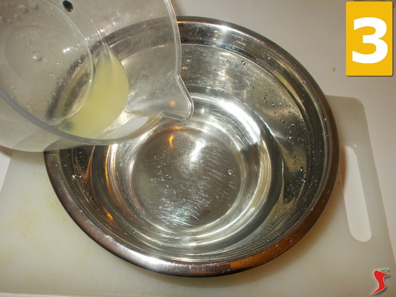 Iniziate la ricetta tagliando a metà il limone (1) per poi spremerlo (2) con lo spremiagrumi. Lasciate da parte i due mezzi limoni spremuti e versate il succo in una planetaria (3) colma di acqua fredda.